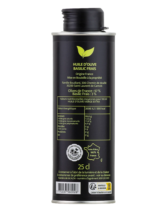 Les olives soigneusement récoltées à maturité sont pressées à froid en même temps que le basilic frais, sélectionné pour son parfum intense et sa fraîcheur.
